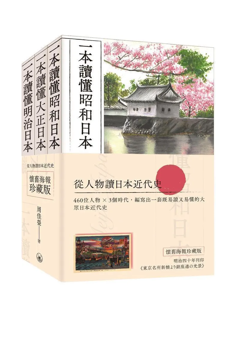 一套三冊的《從人物讀日本近化史》,在明治時代、大正時代及昭和時代選出460位具代表性人物,通過他們構成一幅日本近代史圖像,涵蓋政治、經濟、社會、文化、科技等不同範疇。附書附贈明治四十年刊印《東京名所新橋より銀座通の光景》復刻版珍藏海報。
