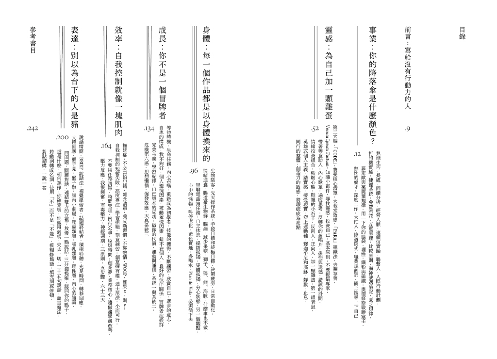 繼《學做龍蝦或騎象人:一名文藝工作者的生活學指南》一書之後,米哈進一步探討擺脫「拖延與懶散」的方法,將研習四十多本著作而來的筆記,寫成了「事業 - 靈感 - 身體 - 成長 - 效率 - 表達」六個部份,指引讀者思考如何成為更有行動力的創作人。