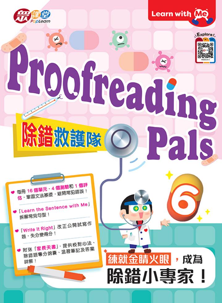 P.1-6,共6冊。涵蓋主流教科書全學年文法重點,以詞性分類,學習內容清晰有序。輯錄各類常見文法錯題,全面戰勝常犯錯誤,提升語文能力。根據教育局最新小學英國語文課程指引編寫,涵蓋主流教科書全學年文法重點,以詞性分類,學習內容清晰有序。全書共6冊,每冊精編16個單元、4個測驗和1個評估,輯錄各類常見文法錯題,全面戰勝常犯錯誤,提升語文能力。練習題型由淺入深,難度逐冊遞增:「Grammar X-rays」介紹文法重點。「Grammar First Aid」分析經典校對題目。「Try with Me」試做經典題目,嘗試應「Grammar First Aid」所學的技巧。「Practise with Me」標示題目難度,循序漸進訓練校對能力,挑戰題有助加強學生解難能力。部份單元設「Learn the Sentence with Me」,拆解常見句型,訓練學生寫出合乎文法的句子。每冊設「Write It Right」,實戰應用全冊的文法重點及校對技巧,通過改正公開試寫作題,幫助學生在公開試取得佳績。隨書附送「家長天書」:「校對心法」扼要總結校對祕訣。「除錯題奪分錦囊」通過例題講解易錯文法重點,提升校對技巧;掃描二維碼 (QR code) 觀看重點校對技巧短片,提高自學效率。「温習筆記」重温文法重點。「答案詳解」提供答案及難題解說,方便家長輕鬆指導子女解答難題。