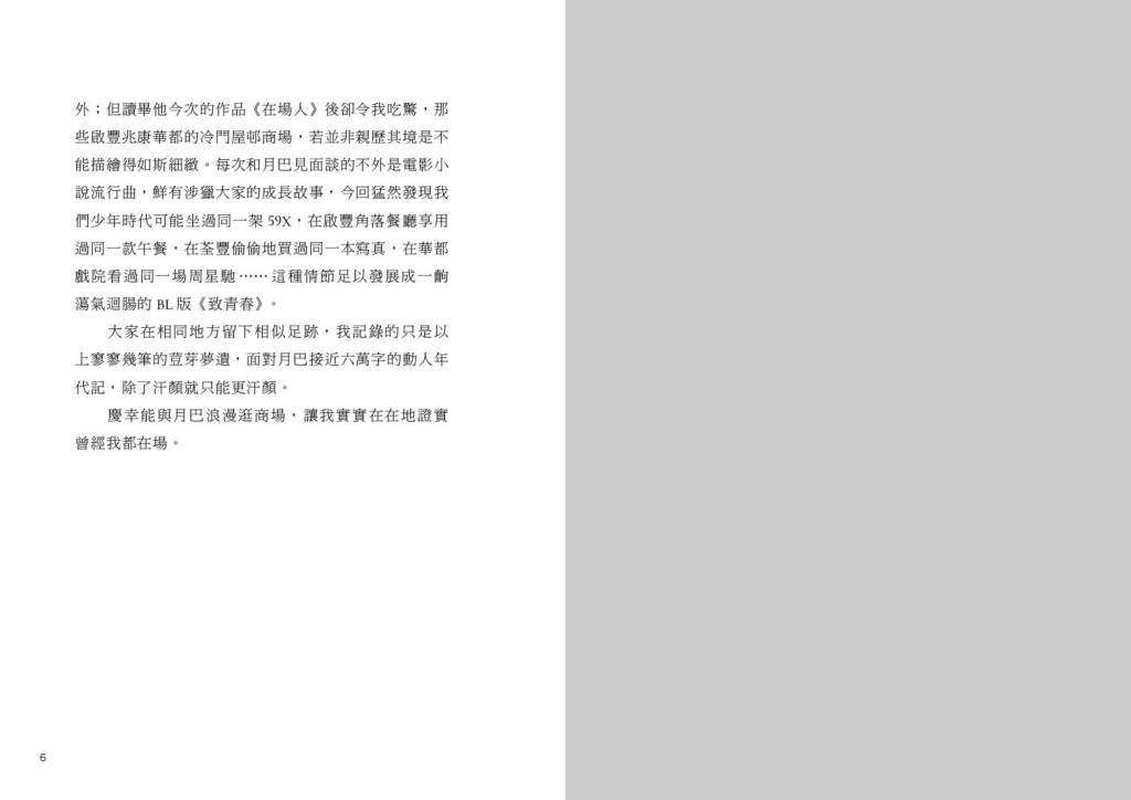 生活文集:《月巴事——是你們走得太快,還是我走得太慢?》、《月巴事二——(從來未聽說)世間一切美好》、《月巴事三——然而人在世界誰能沒去路……》、《月巴事四——有些聲音永遠聽不到》、《寫了》