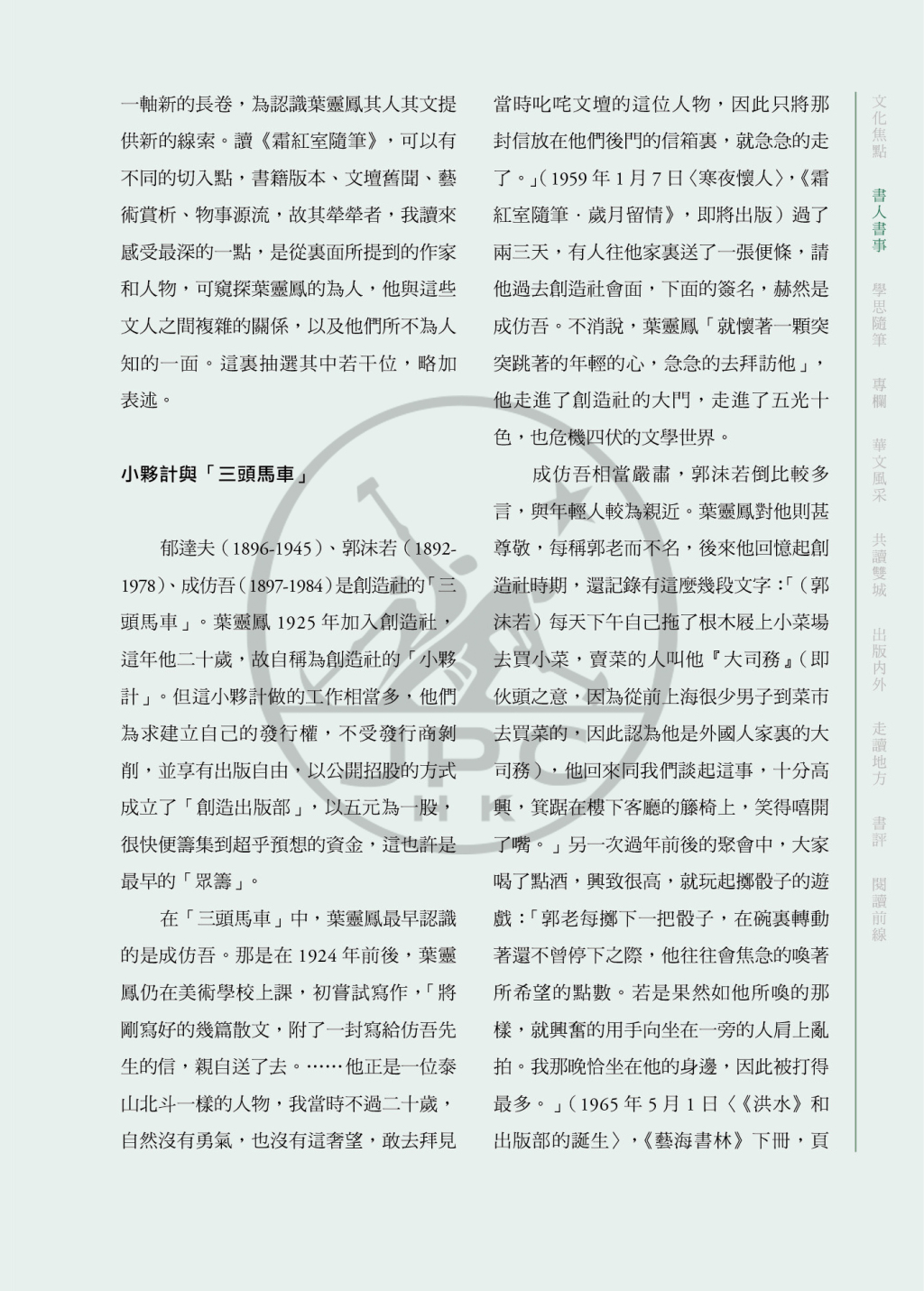 「出版內外」:本期聚焦出版人范用的書籍人生,由汪家明撰文回望這位出版大家如何在動盪時代中,以堅定的文化理想與編輯美學,形塑出一代出版風格。這篇手記式文字既是同行致敬,也是對一種「以書為志」精神的深刻存照。