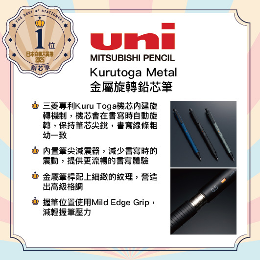 •三菱專利Kuru Toga機芯內建旋轉機制,機芯會在書寫時自動旋轉,保持筆芯尖銳,書寫線條粗幼一致